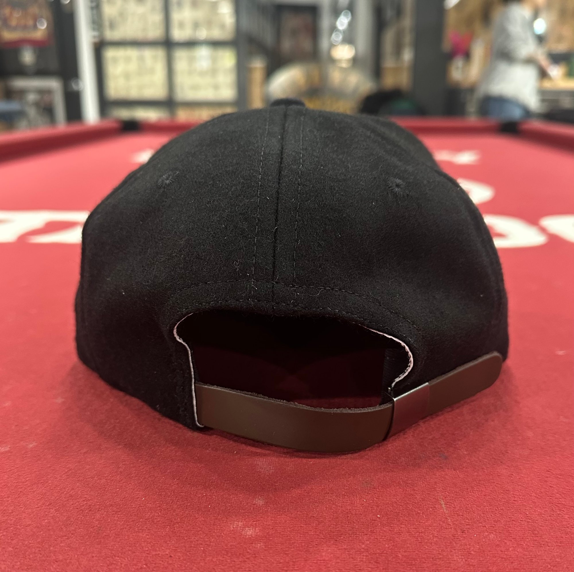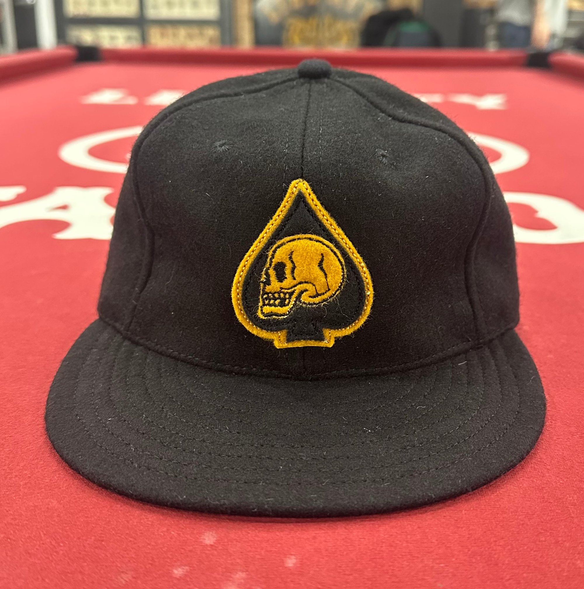 Handmade in USA. Black wool hat w leather strap back and gold felt skull spade patch.
